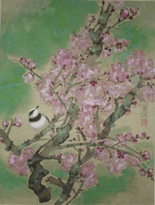 碧桃       作品反映了鸟语花香春光明媚的宜人景色。工具材料:中国毛笔,有色熟宣纸,国画颜料,一得阁高级国画墨汁。绘画手法:没骨、积水撞粉色手法四尺对开方幅约为68×68 (cm)